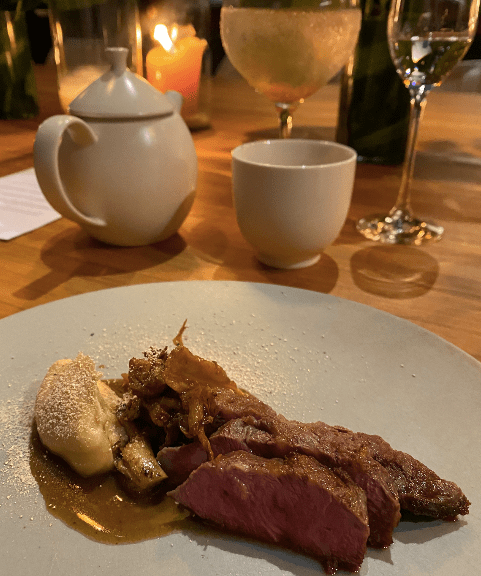 Continuamos con una coliflor rostizada con puré de avellanas, arugula y cúrcuma, cuyo complejo sabor nos fascinó a todos. Después degustamos una pesca de temporada con nabo blanco y zanahorias y una exquisita carne flat iron wagyu cross con apionabo y hongos – un manjar que jugó con nuestros sentidos. Concluyó la cena con un sorprendente y original mousse de kale con granizado de hinojo y uvas verdes.