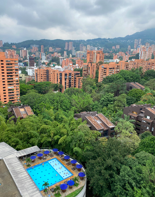 Ganador del Mejor Hotel de Conferencias y Ejecutivo de Colombia, las 5 Estrellas del Hotel son reflejadas en las brillantes luces de Medellín que se expanden a nuestros pies. Desde la enorme terraza de mi gran suite veo los edificios de la ciudad resplandeciendo bajo un cielo despejado, enclavados en montes y montañas.