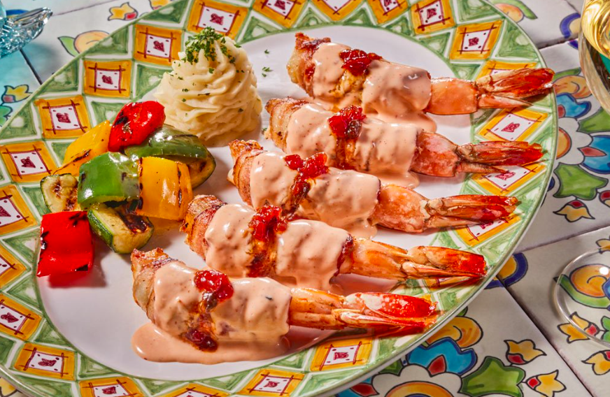 Sin lugar a duda, no dejen de pedir los Camarones Estilo Baja: camarones grandes en mariposa, asados y bañados en salsa de ajo, servidos con arroz del Pacífico, frijoles, tomates, aguacate y albahaca.