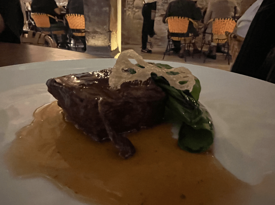 La cena siguió con unos espectaculares chipirones con cebollas a la plancha en salsa tartor de calamar, anchoas y ajos confitados del chef Tomás Kañola y un asado de tira de raís de lotto, maridad con el intrigante vino The Prisoner. Concluimos con un postre llamado Malabi, con frutos rojos, sumac y crocante de masa kadaif.