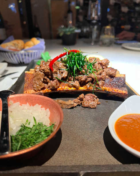 El platillo estrella de la noche y mi favorito, fueron los tacos de tuétano con Rib Eye: dos enormes piezas de tuétano braceadas y coronadas con rib eye, logrado a la perfección, jugoso y sabroso – un verdadero manjar.