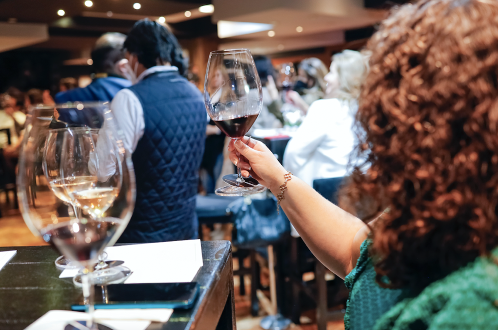 Cuando llegó el turno esperado para el vino Caipirinha 2018, la sommelier Georgina Estrada, embajadora de marca, tomó la palabra para catarlo. Este vino se compone de un ensamble de Cabernet Sauvignon, Syrah, Nebbiolo y Malbec con 24 meses en barricas de roble francés. Es un vino limpio y brillante que en vista presenta un hermoso color rojo rubí intenso, tiene aromas de gardenias, frutas rojas y negras como cerezas, grosellas, frambuesas, marrasquinos y arándanos con notas de madera, tierra mojada y especias como la canela y nuez moscada. Con un ataque medio alto, acidez media, taninos firmes y alcohol en equilibrio con un agradable final prolongado.