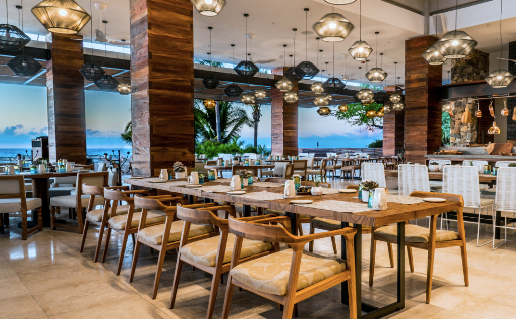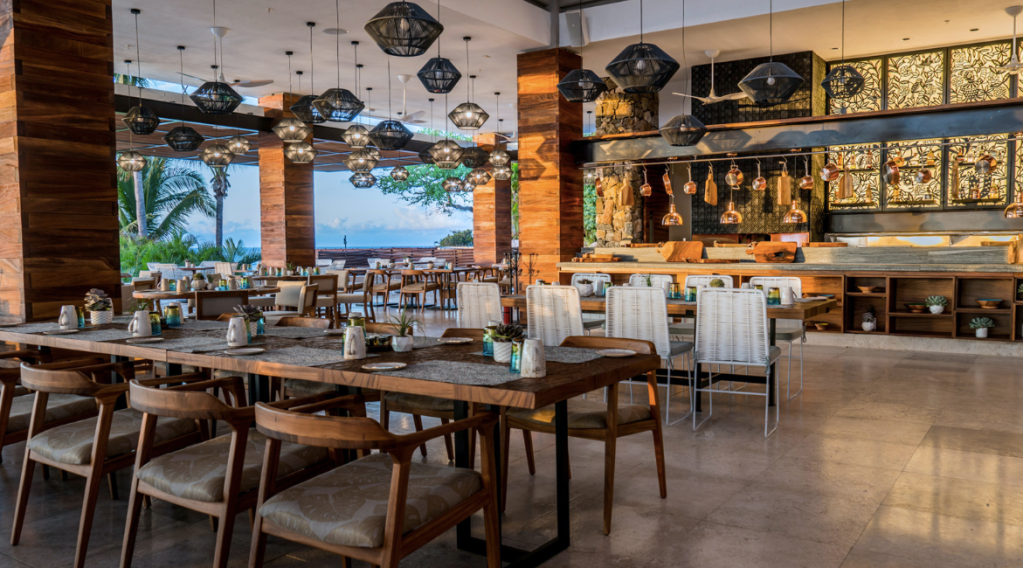Todos los muebles, accesorios de diseño y materiales de construcción se obtuvieron localmente, incluidas las elegantes lámparas de cobre, mosaicos de barro negro, madera de huanacaxtle y textiles. La estética de diseño del restaurante combina las espectaculares vistas del Océano Pacífico con el estilo clásico mexicano y con toques urbanos que hacen de este bello espacio un lugar rico en tradición.