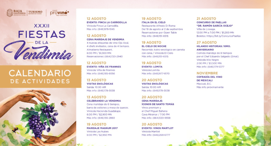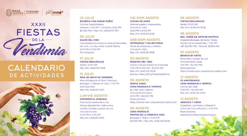 Del del 30 de julio al 21 de agosto el estado de Baja California está viviendo la trigésimo segunda edición de las Fiestas de la Vendimia, la celebración del vino más grande de Latinoamérica que reúne a las bodegas más importantes de la región, cocineros de talla nacional e internacional, celebridades y diversas experiencias para los aficionados al vino; anunciaron esta tarde en conferencia de prensa en la CDMX, José de Jesús Quiñónez, Subsecretario de Turismo del Estado de Baja California, y Mauricio Cantú, Presidente del Comité Provino de Baja California y Organizador de las Fiestas de la Vendimia.