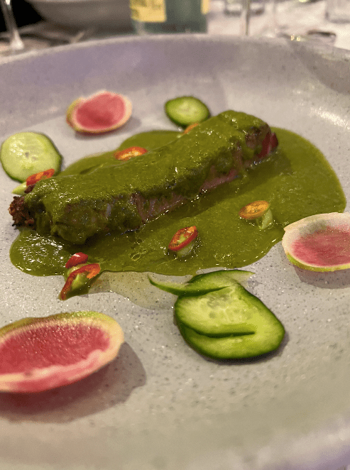 Continuamos con un delicioso tamal de cangrejo y vino de Mendoza, llamado Proyecto las Compuertas. El tercer ‘paso’ fue un aguachile de rib-eye prime cab a las brasas, cuyos intrigantes sabores maridaron perfectamente con el vino El Enemigo de Mendoza.
