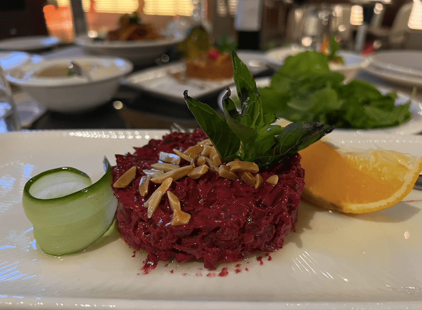 En su restaurante estrella tuve el placer de disfrutar de su ya celebre ‘one-meter kebab’, un kebab de carne de un metro, cuya infinidad de exquisitas guarniciones llenan la mesa con color y aromas antojosos. Entradas exquisitas como Kubbeh frito con yogurt de ajo y nueces, el clásico arroz oriental Ouzi Bel con cordero y pepino, y mi favorito, el muhamarra de pimientos y chiles, fueron el comienzo de una aventura sensorial.