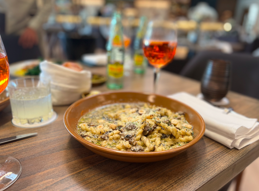 También me deje llevar por los exquisitos sobres de la pasta Gemelli Fungi con salsa de hongos, avellanas crujientes, hongos salteados y queso de graba padano. Entre sus pizzas estrella se encuentran la quattro formaggi e pomdoro con queso mozzarella, cabra, gorgonzola y parmesano, y la Mediterránea con queso mozzarella, pimientos, tomates deshidratados, albahaca y salami artesanal.