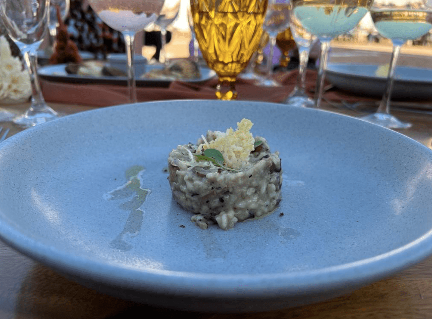 Después continuamos con un risotto de hongos con mantequilla, vino blanco, queso parmesano, hongos y trufa negra – una de las joyas gastronómicas del chef de Viñedos Santa Catalina, la más reciente adición al desarrollo de La Santísima Trinidad. Este platillo maridó a la perfección con el vino espumoso rosé, una mezcla de uvas Caladoc, Cabernet Franc y Malbec – fresco y seductor.