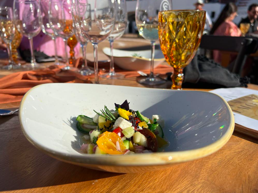 A través de una dinámica única, La Santísima Mesa expresa la riqueza arquitectónica, gastronómica y enológica de la región. La experiencia culinaria comenzó con una ensalada griega con pimiento amarillo, cebolla morada, pepinos, tomate cherry, aceituna negra, orégano, aceite de olivo y queso feta, la cual maridamos con el vino La Santisima Trinidad Blend Blanco, elaborado con las uvas Chardonnay, Macabeo y Moscatel.