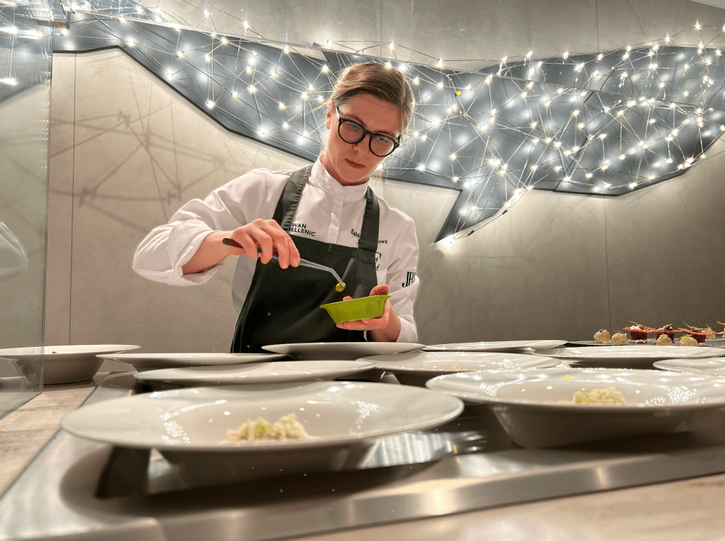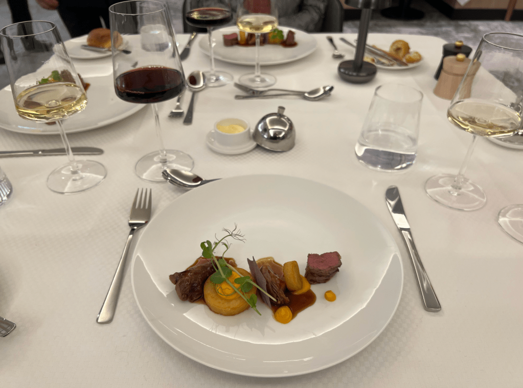 De regreso en el hermoso barco SH Diana, disfruté de una exquisita cena elaborada por los chefs invitados, Grega y Sabina Repovz. Entre los manjares que elaboraron para nosotros esta talentosa pareja había trucha escalfada, ragú de ternera con huevo frito y un exquisito cordero en su jugo – todo maridado con excelentes vinos de Italia, Francia y España.