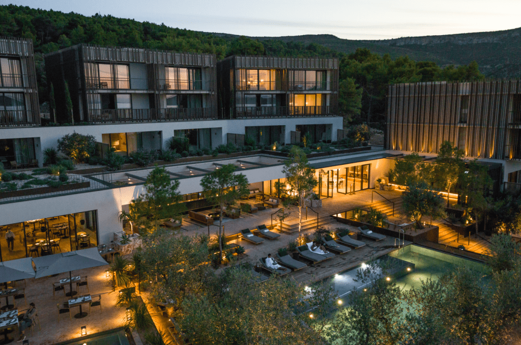 Maslina Resort fusiona estilos mediterráneos clásicos con toques franceses contemporáneos, respetando la naturaleza ya presente como base de la filosofía de diseño.