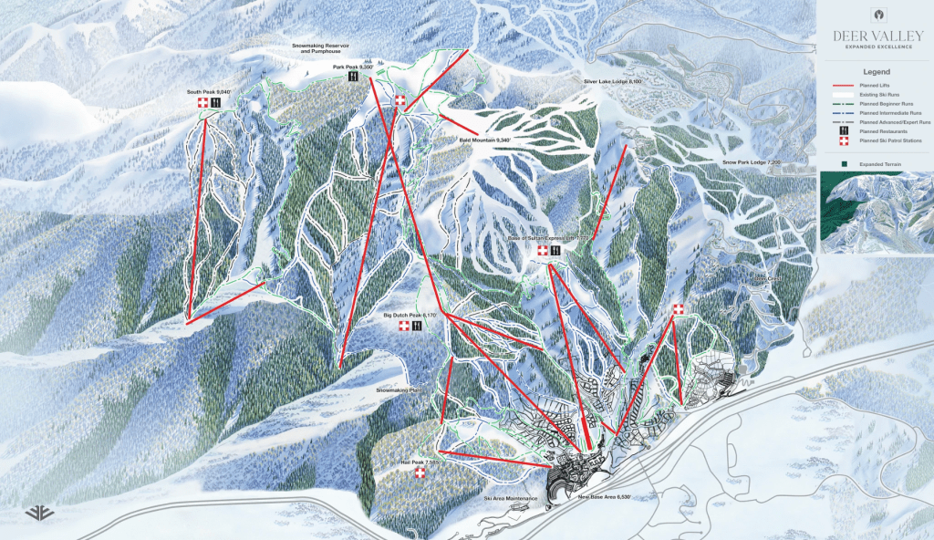 “Expanded Excellence”, en su totalidad, duplica con creces el terreno esquiable del resort, ofrece una nueva aldea en su base, que ofrece a los huéspedes oportunidades y comodidades de primer nivel, reimagina Snow Park con una nueva aldea base y revitaliza las instalaciones existentes de Deer Valley Resort.