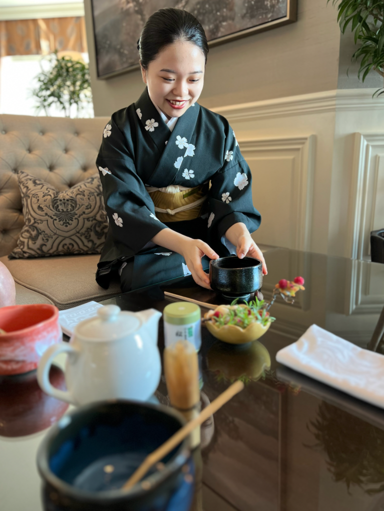 En el Club Lounge en el piso 34, donde la alta sociedad de Osaka se deja apapachar por exquisitas degustaciones, por momentos relajados y cómodos, por el ambiente elegante y por su magnifica y elegante decoración clásica, tuve el placer de disfrutar de una autentica ceremonia de té. Aquí aprendí la técnica tradicional para hacer el te verde matcha y gocé de este manjar en un ambiente infinitamente sofisticado.