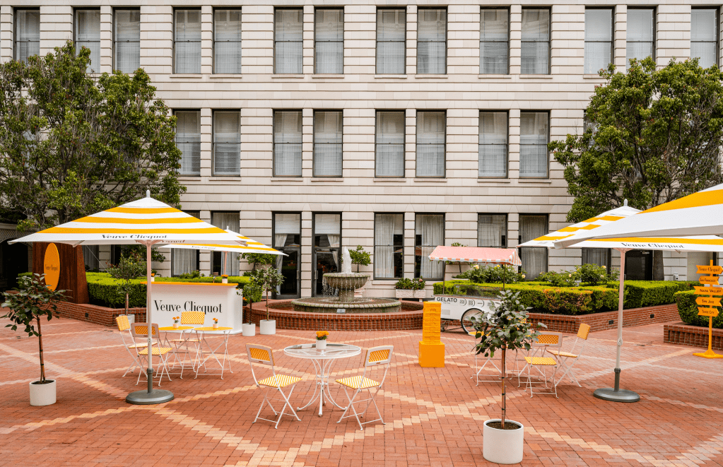 Sombrillas amarillas y blancas con muebles lujosos, mesas de café de inspiración francesa y juegos de gran tamaño como Jenga y Corn Hole llenan el patio y brindan a los huéspedes una agradable experiencia de verano al aire libre. Las opciones de bebidas se pueden combinar con un menú elevado que incluye una Seafood Tower para dos, The Ritz-Carlton, San Francisco Signature Caviar Service, un carrito Gelato Festival y más.
