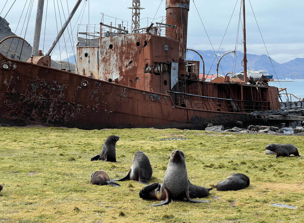 Después desembarcamos en Grytviken, la histórica estación ballenera donde está enterrado el legendario explorador británico Ernest Shackleton. Aquí, la naturaleza ha reconquistado la tierra y docenas de lobos marinos juegan, corren y descansan bajo la sombra de las ruinas de este intrigante entorno.