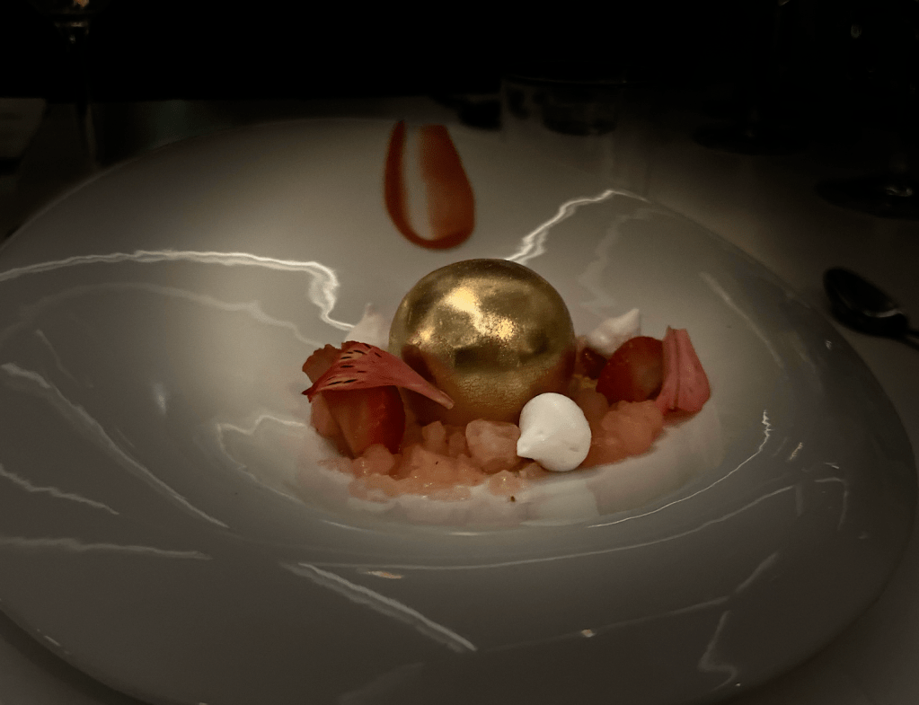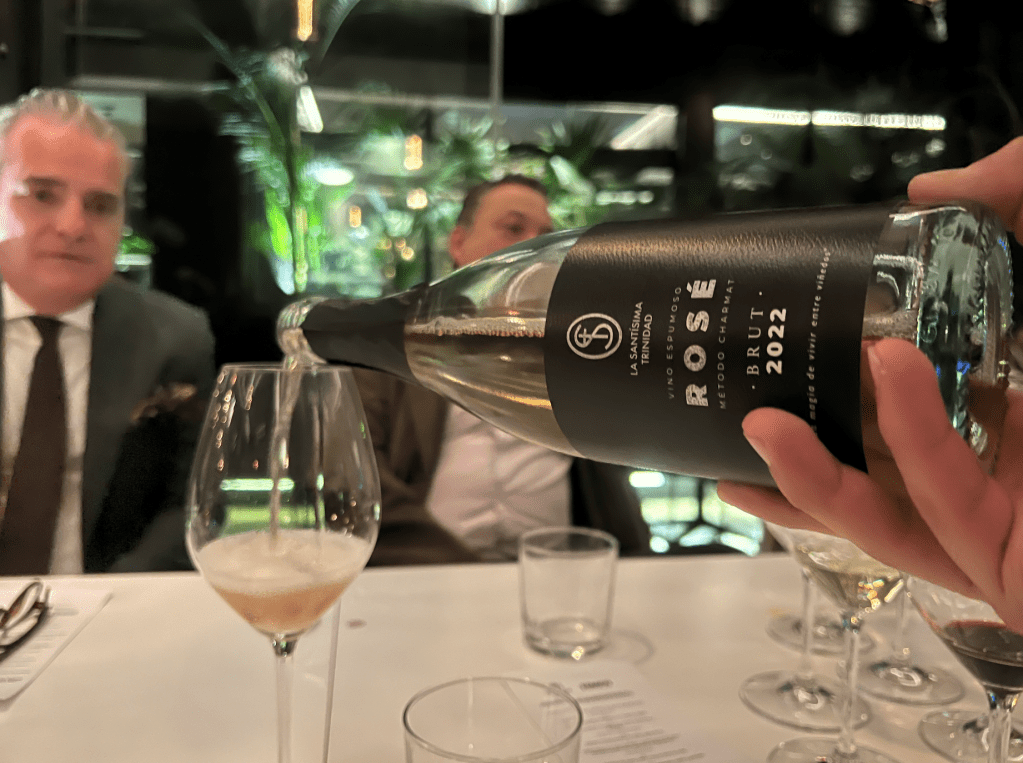Terminamos la velada con broche de oro: copita de chocolate con nueces caramelizadas, vainilla y granizado de café, y una esfera de oro con curado de fresas con pulque. El espumoso Rosé de La Santísima Trinidad acompañó a la perfección estos exquisitos postres. Evocando los campos de lavanda que corren al paralelo de los viñedos de La Santísima Trinidad, el Rosé presenta un color rojizo vivaz, con tonos acerados, brilloso y limpio, y en boca tiene entrada amable y sucrosa, untuoso y con presencia de frutas rojas en el paladar y retrogusto.