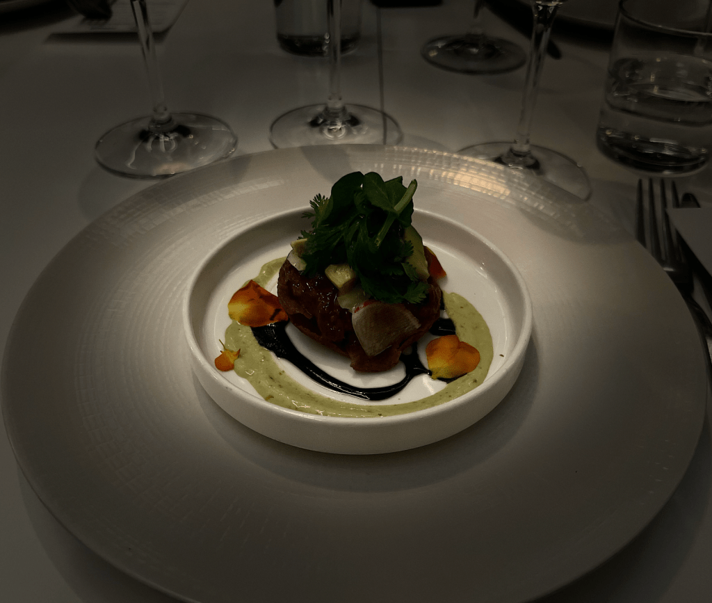 Continuamos con un profiterol del Chef David Romero, con brandada de bacalao con crujiente vegetal, una expresión de los ingredientes y sabores tradicionales de Barcelona. El siguiente platillo lo elaboró Billy: una tosta de camarón y jengibre con ajonjolí, ajochile rojo y verdolaga, el cual maridamos con el delicado y sabroso Blend Blanco de La Santísima Trinidad. Los sabores de este hermoso viñedo en San Miguel de Allende lucen en todo su esplendor al expresar la riqueza de su terroir y los días soleados de uno de los destinos más bellos de México.