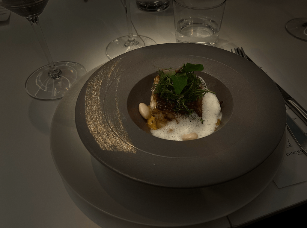 Disfrutamos de un Canelón a la Barcelonina con trufas negras y una Lobina rallada con mojo de hongos, polenta cítrica de chorizo ahumado y queso cotíja y aguaviento de hierba de limón. Maridamos estos manjares con Terrunyo Carmenere, enamorados de su color rojo violeta oscuro intenso. Este vino muestra todo el carácter del Carmenere puro con notas de arándanos y frutos del bosque, y toques de cedro y violeta; en boca es afrutado y sabroso.