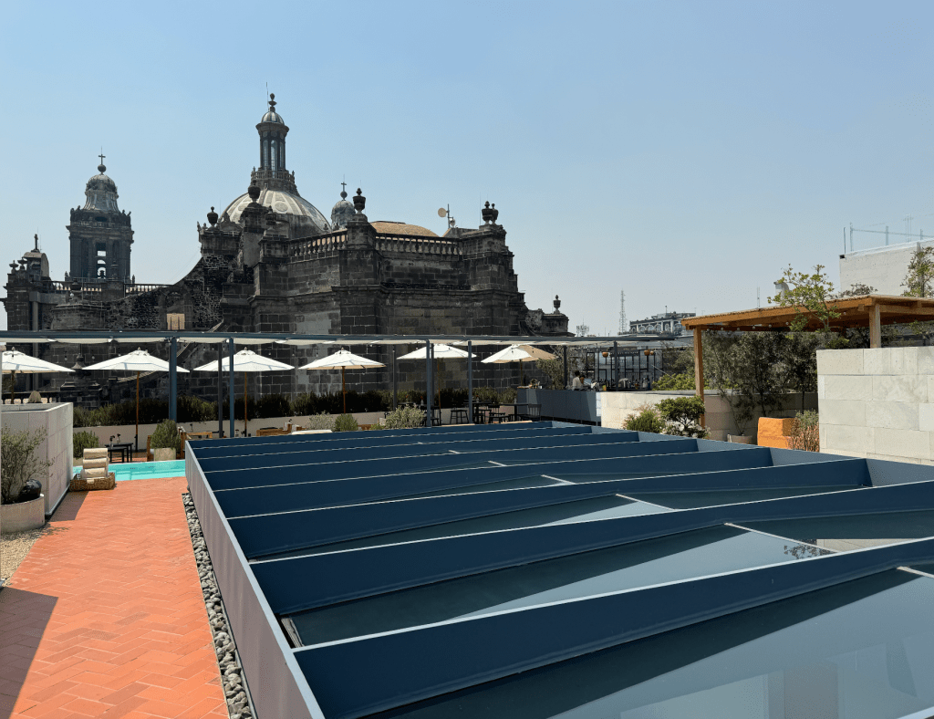 Mi espacio favorito del hotel, donde pasé muchas horas de relajación, placer culinario y hedonismo, es La Terraza, un ícono de Grupo Habita. La Terraza cuenta con alberca y restaurante que ofrecen vistas emocionantes a la Catedral Metropolitana, Palacio Nacional y Tempo Mayor convirtiéndola en el lugar de reuniones más atractivo de la Ciudad.