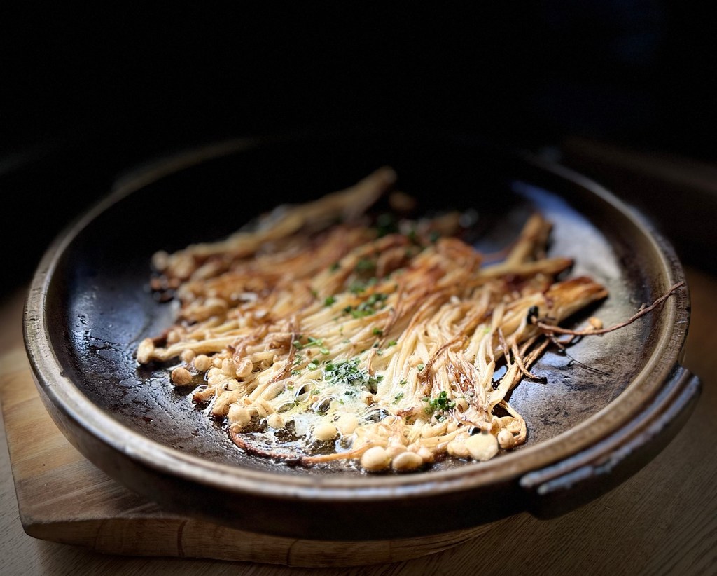 Después me deleité con otra exquisita creación: los Enokis Calientes a la Mantequilla. Estos delicados hongos enoki son cuidadosamente salteados en mantequilla dorada, resaltando su sabor natural y creando una textura irresistiblemente suave. Cada bocado es una experiencia de indulgencia, una combinación perfecta de simplicidad y sofisticación, servidos hirviendo en la mesa.