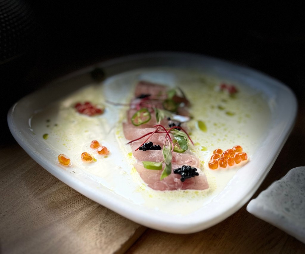 Cada bocado es una experiencia única, donde la suavidad del pescado se encuentra con la intensidad del yuzu, creando una armonía perfecta en el paladar. La adición de ikura y caviar añade un toque de lujo y sofisticación, mientras que el chile serrano proporciona un toque de picante que despierta los sentidos y eleva aún más el sabor. Este platillo es también una obra de arte culinaria, presentada con elegancia y cuidado para deleitar tanto la vista como el paladar.