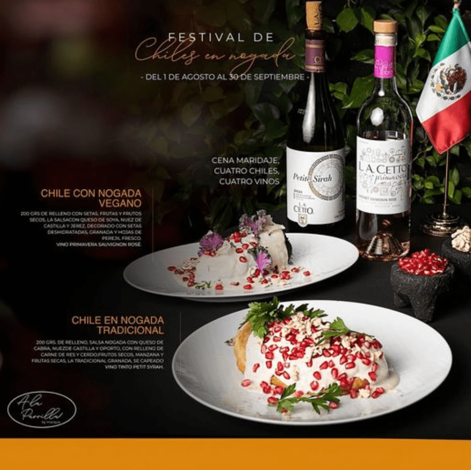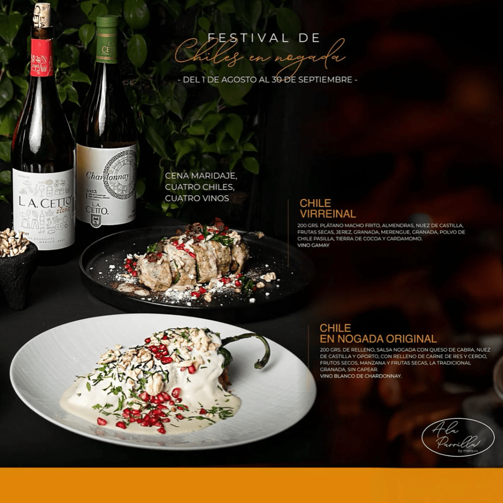 En A la Parrilla, dentro del ambiente chic del hotel Marquis Reforma, podremos disfrutar del Festival de chiles en Nogada, con la propuesta Cuatro de Cuatro: Cuatro chiles armonizados con cuatro vinos de La Cetto.
