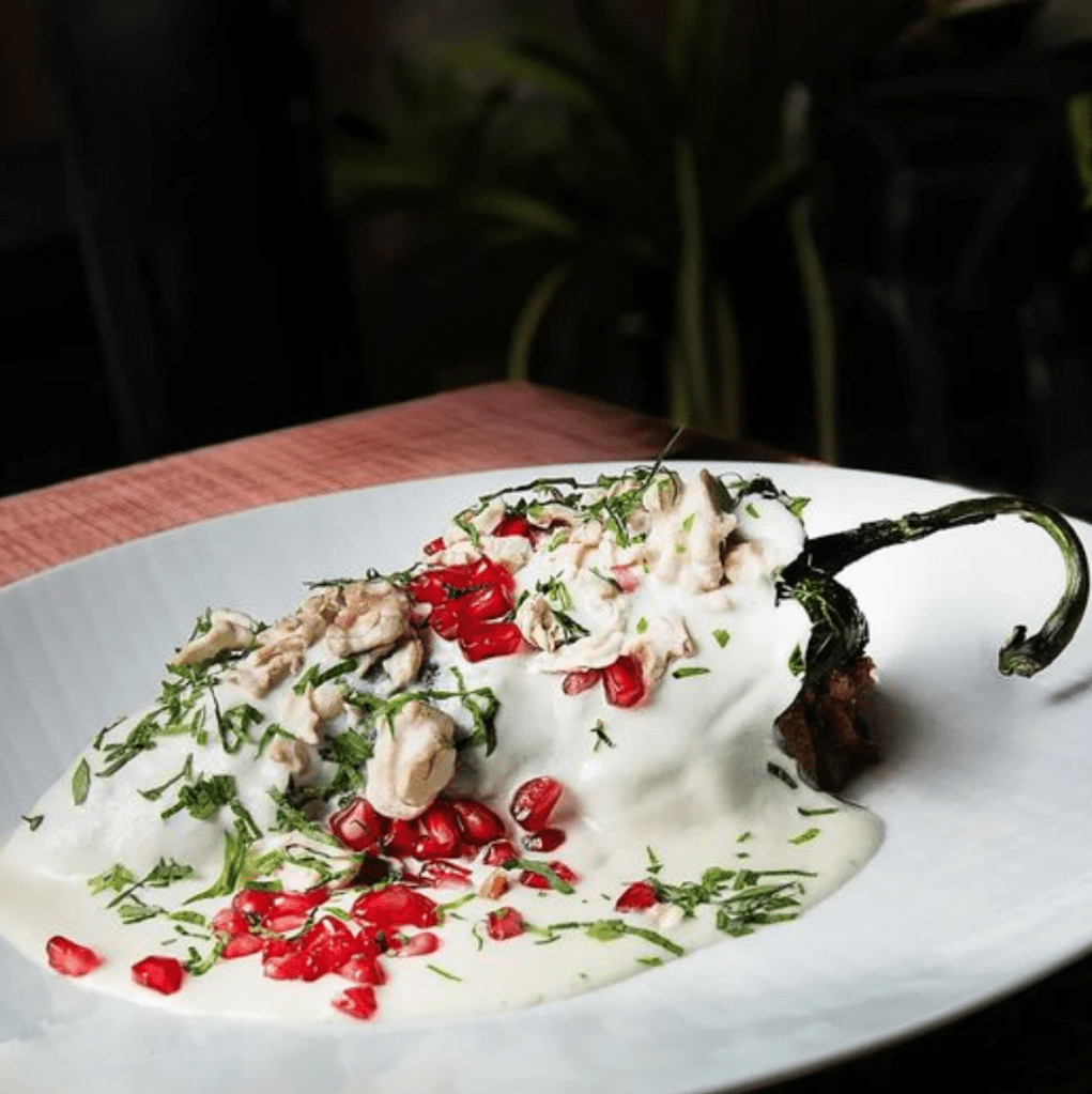 Es un chile con 200 grs. de relleno, salsa nogada con queso de cabra, nuez de castilla y oporto, con relleno de carne de res y cerdo, frutos secos, manzana y frutas secas, la tradicional granada, capeado, y con maridaje con Vino Tinto Petit Syrah.