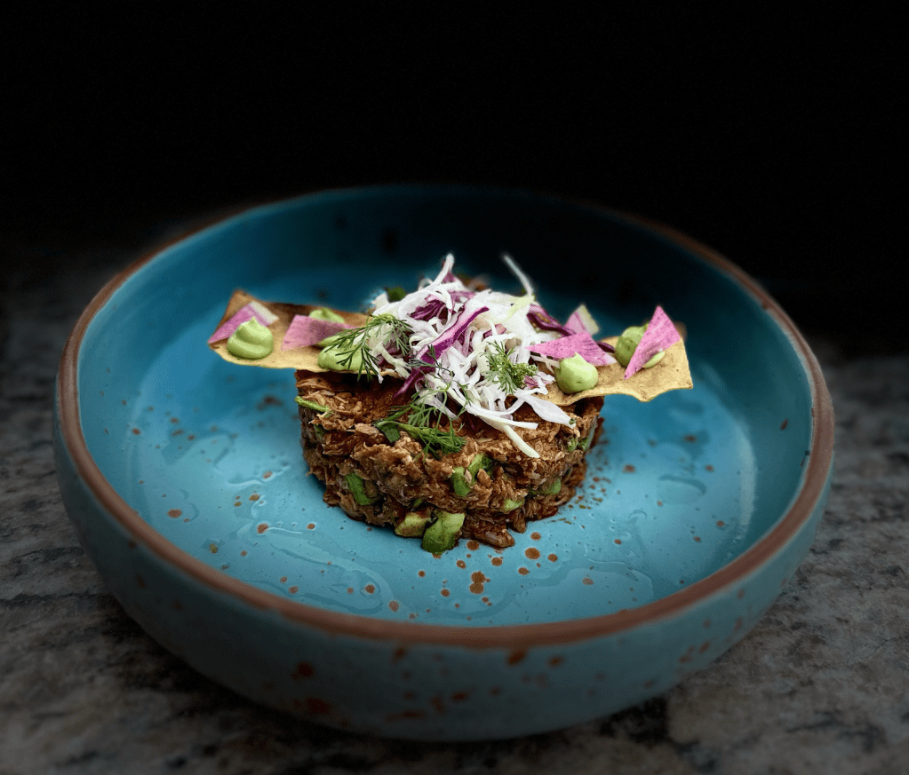 En este edén culinario podemos disfrutar desde mariscos frescos provenientes de pesqueras sostenibles, hasta un exquisito pastel de chocolate complementado con mole negro de Oaxaca. El plato de Camarones Caribeños con arroz estilo Tumbada, acompañado de chirivía, epazote y amaranto, es una explosión de sabores auténticos que celebra la riqueza culinaria de la región. Los camarones, frescos y jugosos, se combinan con un arroz aromático al estilo Tumbada, caracterizado por su preparación rica y especiada. La chirivía aporta una dulzura sutil, mientras que el epazote añade un toque herbáceo distintivo, y el amaranto ofrece una textura crujiente que enriquece el plato. Este manjar es un ejemplo perfecto de la creatividad y la innovación que definen la cocina de Casa Mayor.