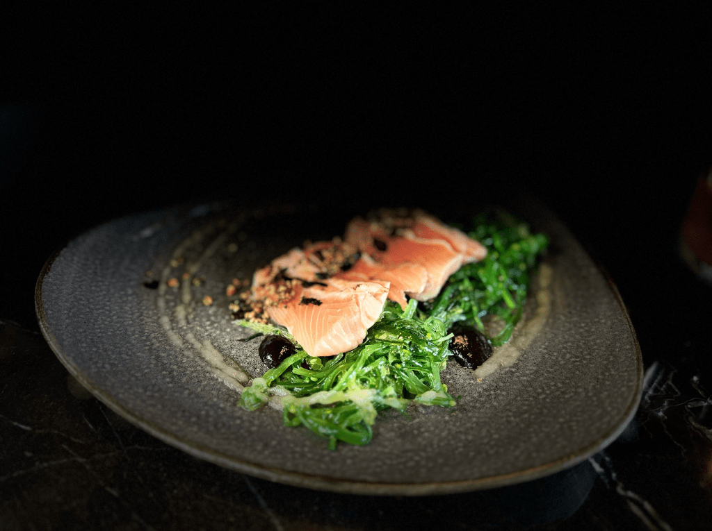 Entre las delicias que probé, los spring rolls se destacaron por su crujiente perfección y su salsa acompañante que realzaba su frescura. El plato principal, el salmón flameado aburi, resultó ser una experiencia sublime; el pescado estaba cocido a la perfección, y la técnica de flameado le aportó una profundidad de sabor que me dejó maravillado. No menos impresionante fue el tuétano, maravillosamente asado y servido con una combinación de acompañamientos, como coco rallado, que destacaban su sabor y textura.
