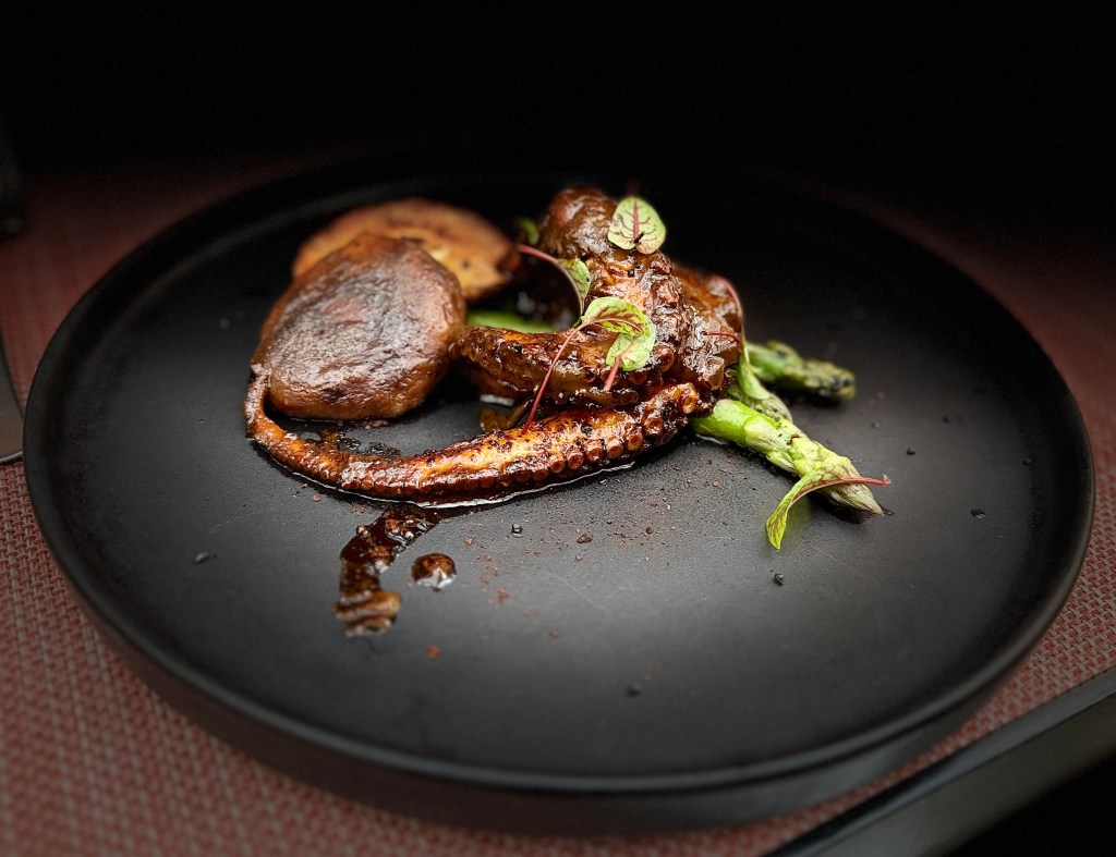 Uno de los platillos más emblemáticos de la carta de A La Parrilla es el pulpo a las brasas con mole, una fusión excepcional de dos tradiciones culinarias profundamente enraizadas en la cultura mexicana. Este platillo combina la técnica de asado de la cocina Robatayaki con la riqueza y complejidad del mole, que es uno de los ingredientes más representativos de México. El pulpo, con su textura suave y un ligero toque ahumado por el asado, se acompaña de una salsa encacahuatada y chiles secos, lo que intensifica la experiencia con un contraste de sabores ahumados, picantes y terrosos que enaltecen la frescura del marisco. El mole, con sus capas de sabor y especias, añade una dimensión rica y profunda que eleva este platillo a un nivel sublime, haciendo de cada bocado una verdadera celebración de la cocina mexicana.