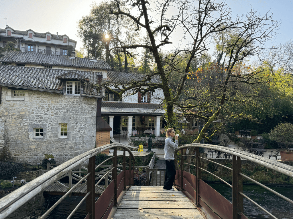 Aquí, mi refugio fue el encantador hotel Moulin du Roc, donde el murmullo del agua relata cuentos antiguos por la noche. Este precioso hotel, con su histórico molino, su arquitectura rústica y acogedora, me ofrecía un paisaje de ensueño, donde la naturaleza y la historia se funden en un abrazo. Mi enorme suite fue un portal al pasado donde la elegancia clásica de la campiña francesa estuvo presente en cada rincón.