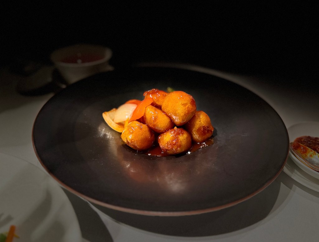 Mi momento preferido fue el maravilloso foie gras agridulce. La unión de estos dos mundos culinarios —el de la refinada cocina francesa y la complejidad de los sabores chinos— es simplemente sublime. El foie gras, suave y cremoso, se ve abrazado por una capa agridulce que lo eleva a nuevas alturas. Esta es una declaración de elegancia, un equilibrio perfecto entre la delicadeza y la audacia.