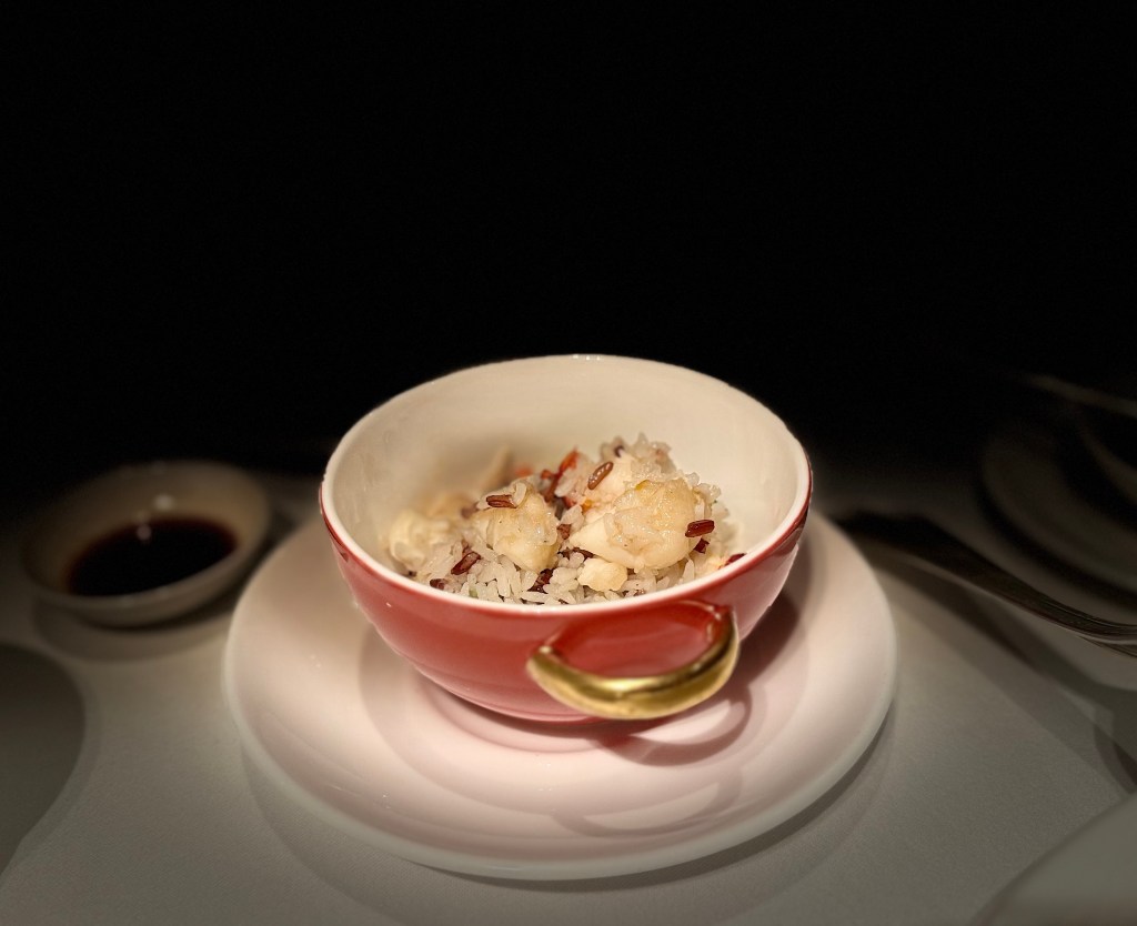 El pato Pekín, rostizado con una precisión impecable, se sirve envuelto en hojas de lechuga crujiente. Parte de esta sinfonía de sabores, el arroz frito con langosta y espárragos me lleva a un lugar de profunda satisfacción. Los granos de arroz, perfectamente salteados, se entrelazan con la suavidad de la langosta y la frescura de los espárragos, en una mezcla que se siente a la vez casera y elevada.