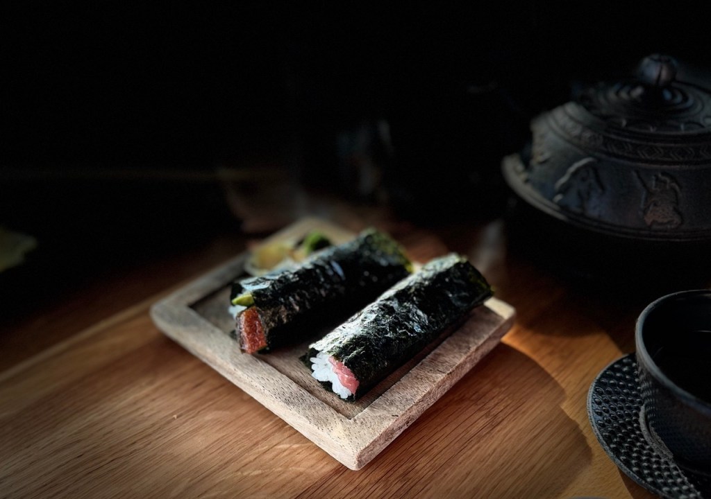 Luego, el Hamachi no Yuzu maki aparece, una obra visualmente impresionante, un contraste entre el amarillo pálido del aguacate y el verde brillante del pepino. El hamachi, fresco y terso, recubre el rollo con una suavidad casi etérea, como si quisiera desvanecerse en el aire. Dentro, el aguacate y el pepino se combinan en una sinfonía de frescura, mientras que encima, el yuzu kosho y la granada explotan en un estallido de sabor, una frescura que corta la pesadez del mundo y te transporta a un lugar lejano, donde el sol brilla con fuerza. La salsa yuzu y la de anguila complementan este plato con una dulzura profunda que se une a la acidez del yuzu, creando un juego delicioso entre lo dulce, lo ácido y lo salado.