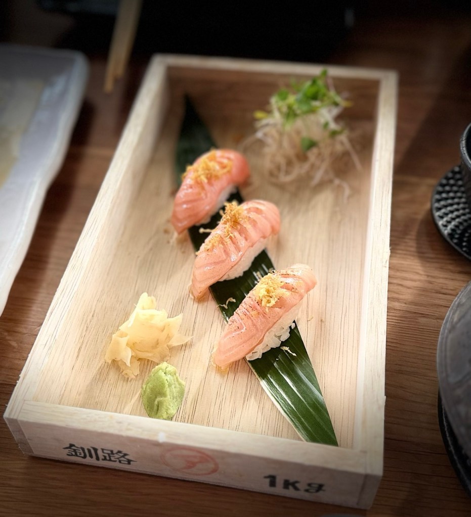 El primer plato que llega ante mí es una obra de arte suspendida en el aire. Los nigiris al carbón, delicadamente ahumados, se presentan ante mis ojos como joyas que prometen revelar secretos. El salmón, bañado con aceite de trufa, se derrite en mi boca, una explosión de suavidad y profundidad. Cada fibra del pescado, tan fina, tan perfecta, se entrelaza con el toque sutil de la trufa, un perfume que se queda en el aire como un eco, añadiendo misterio a la experiencia. La anguila, también al carbón, se encuentra con el foie gras en un abrazo celestial. La suavidad del foie se funde con la intensidad de la anguila, creando un contraste que me deja sin palabras, cada bocado una danza perfecta de texturas y sabores.