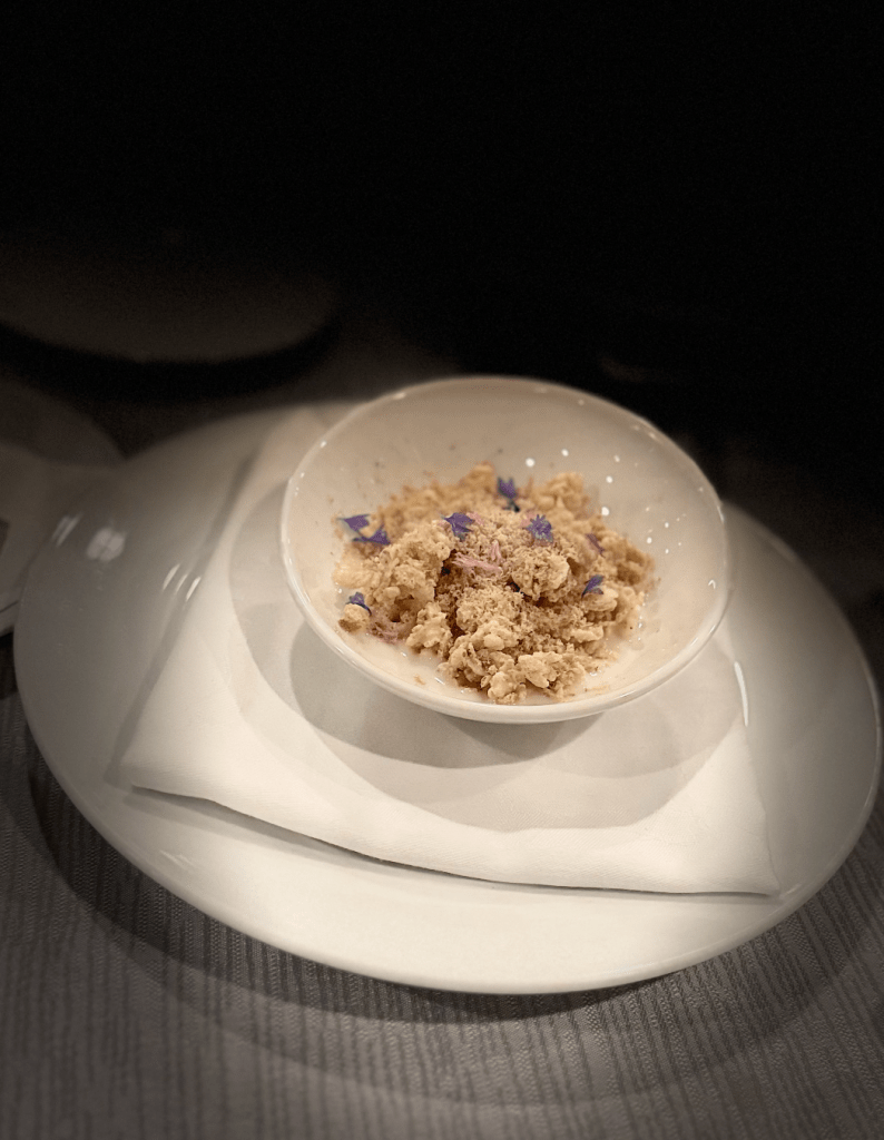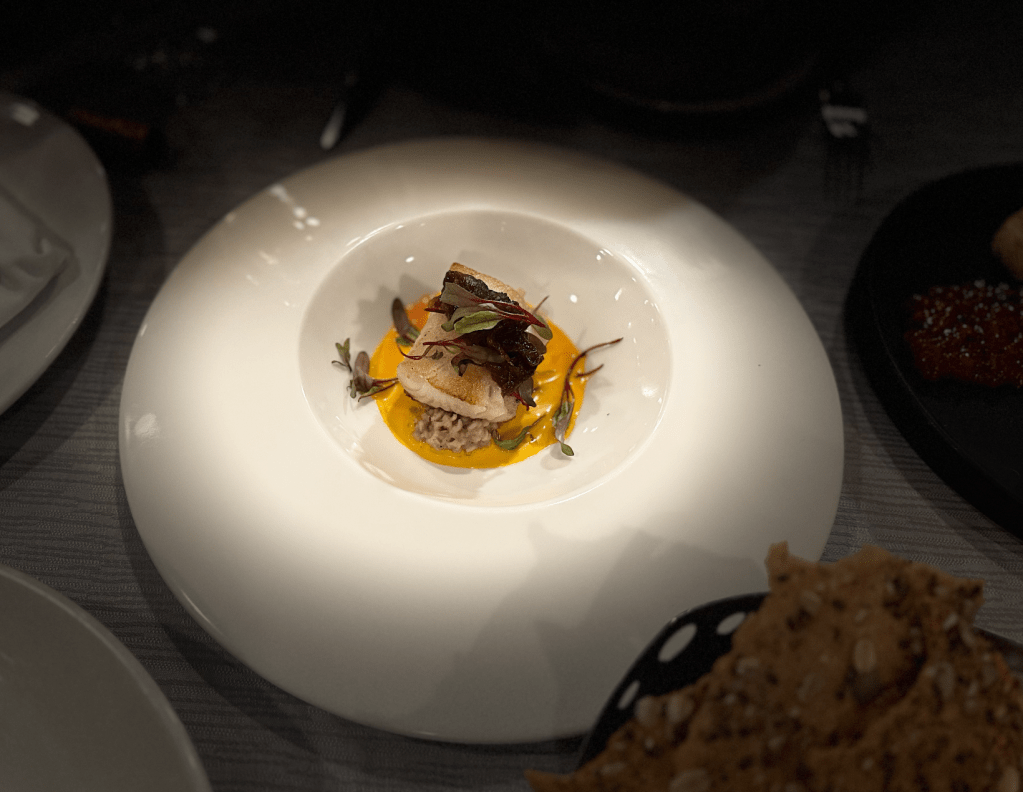 Uno de los primeros platos que probé fue el Carrot Cured Salmon Mousse. Este entrante tiene una presentación impecable, con salmón curado delicadamente, complementado por un mousse de zanahoria que aportaba un toque ligeramente dulce y cremoso. La combinación con ajo asado, berro y la quinoa inflada aportó una textura crujiente y un equilibrio perfecto entre lo suave y lo fresco. Un comienzo vibrante y lleno de sabores que despiertan los sentidos.