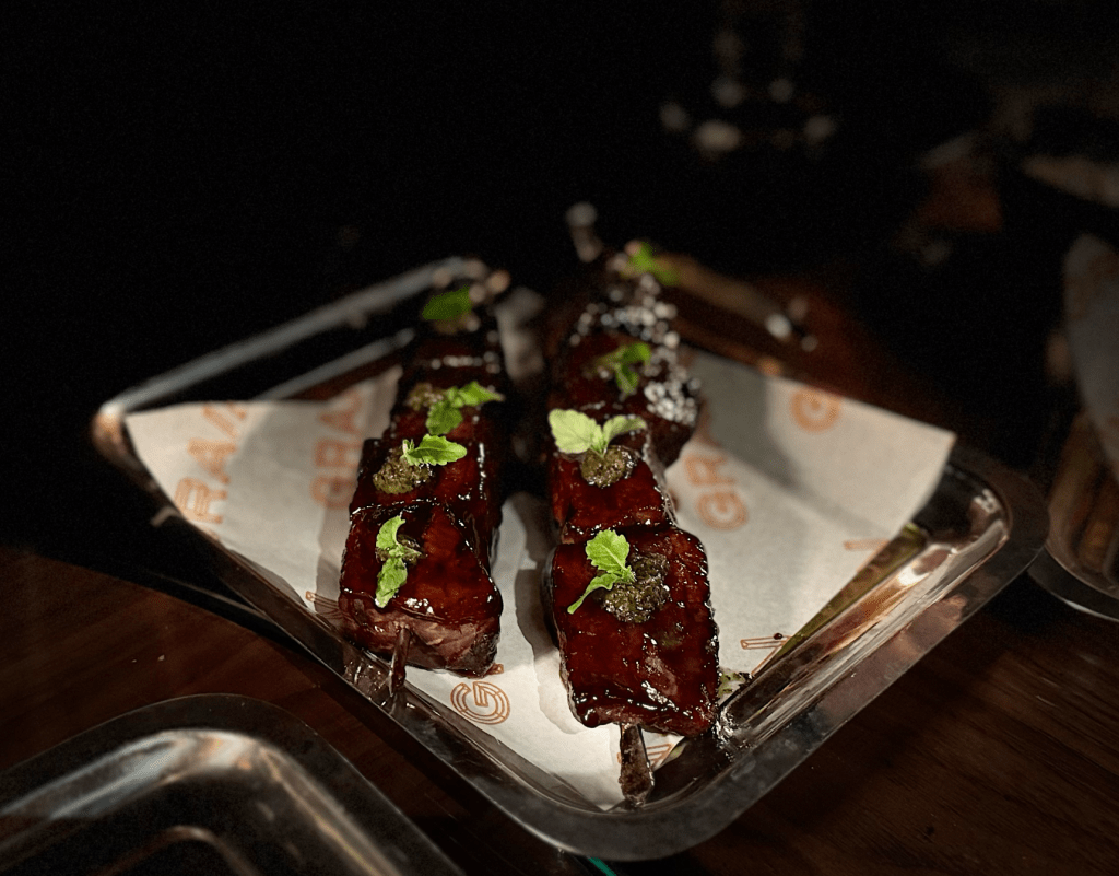 Creativas delicias acompañaron mi debida; una brocheta de wagyu que se deshacía con la mirada, jugosa, intensa, casi un susurro en el paladar; y unas papas fritas cubiertas de parmesano y trufa que reinventaban lo simple en algo sublime. En cada bocado había un guiño del chef, una complicidad silenciosa entre el sabor y el alma. Miraba alrededor y notaba que no estaba solo: las risas suaves de los comensales, las miradas cómplices, el tintinear de los vasos creaban una sinfonía urbana que no necesitaba director.