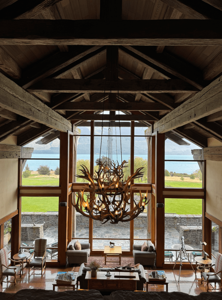 Desde el primer paso en sus senderos, el alma se aquieta. Ciervos salvajes cruzan los pastizales como fantasmas nobles, las montañas se derraman sobre el lago como si quisieran beber de él. La arquitectura de Blanket Bay —de piedra, madera, alma alpina— dialoga con el paisaje en lugar de interrumpirlo. Techos altos, vigas expuestas, rincones con chimeneas vivas, todo está pensado para que uno se sienta abrazado por el lugar, no separado de él.