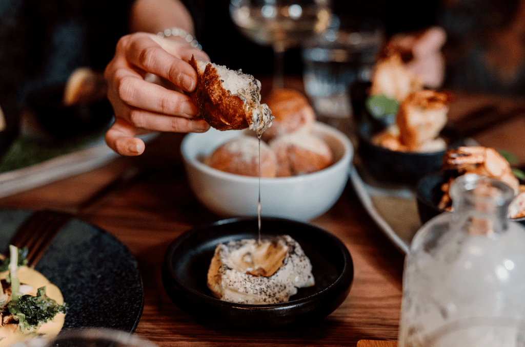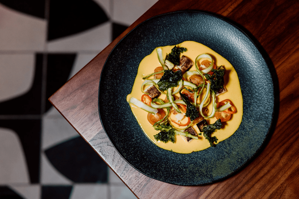 Todo maridado con vinos naturales que hablaban de hedonismo, con mezcales que abrían ventanas al sur y cócteles que jugaban con notas de humo, chile y flor. Cada sorbo era parte de la coreografía, pensado para elevar, no eclipsar. Y entonces, como en todo ritual perfecto, el postre. Una creación que no endulza: seduce. Cremas y frutas, cenizas dulces y crocantes de cacao que parecían contar una historia en murmullos.