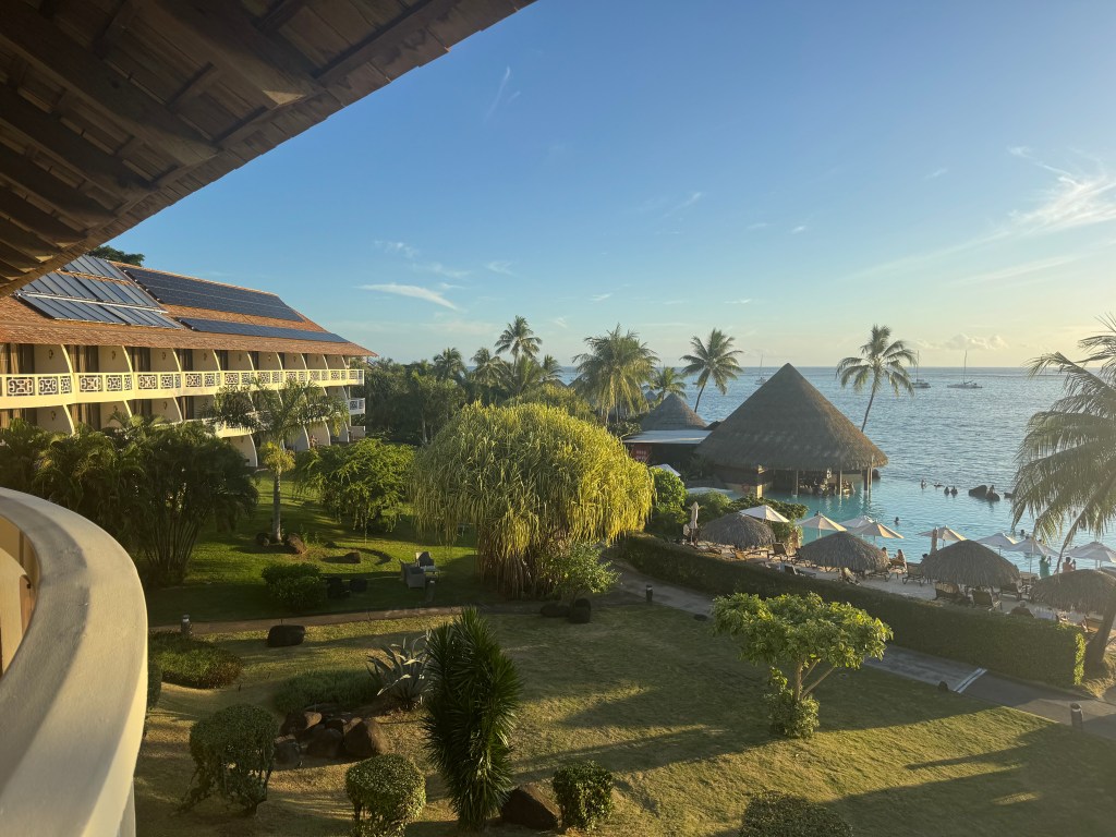 Las pasarelas de madera sobre el agua me guiaron hacia el mar, los bungalows del hotel suspendidos sobre el cristal infinito del océano. Allí, cada amanecer se volvía ritual: el sol acariciando el horizonte, Moorea espiándonos desde la distancia, y el silencio solo interrumpido por el canto suave del agua besando los pilotes. Las horas fluían como el vino en las noches tibias de verano, sin prisa, sin tiempo, con esa cadencia tan rara que solo la felicidad puede otorgar.