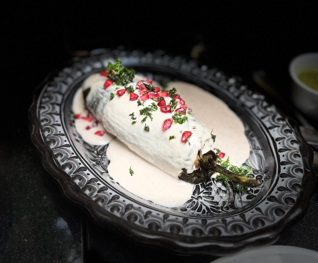 Adentro, todo respira una nostalgia cuidada. El piso de mosaico, las lámparas que cuelgan como joyas de otros siglos, los espejos que reflejan más que rostros: reflejan épocas. Aquí, el tiempo se dobla sobre sí mismo. Las voces bajan el tono, los pasos se hacen suaves, como si supieran que caminan sobre historia. Y entonces, llega el plato que esperé todo el año, como se espera a un viejo amor que regresa con la promesa de nuevas emociones. El chile en nogada.
