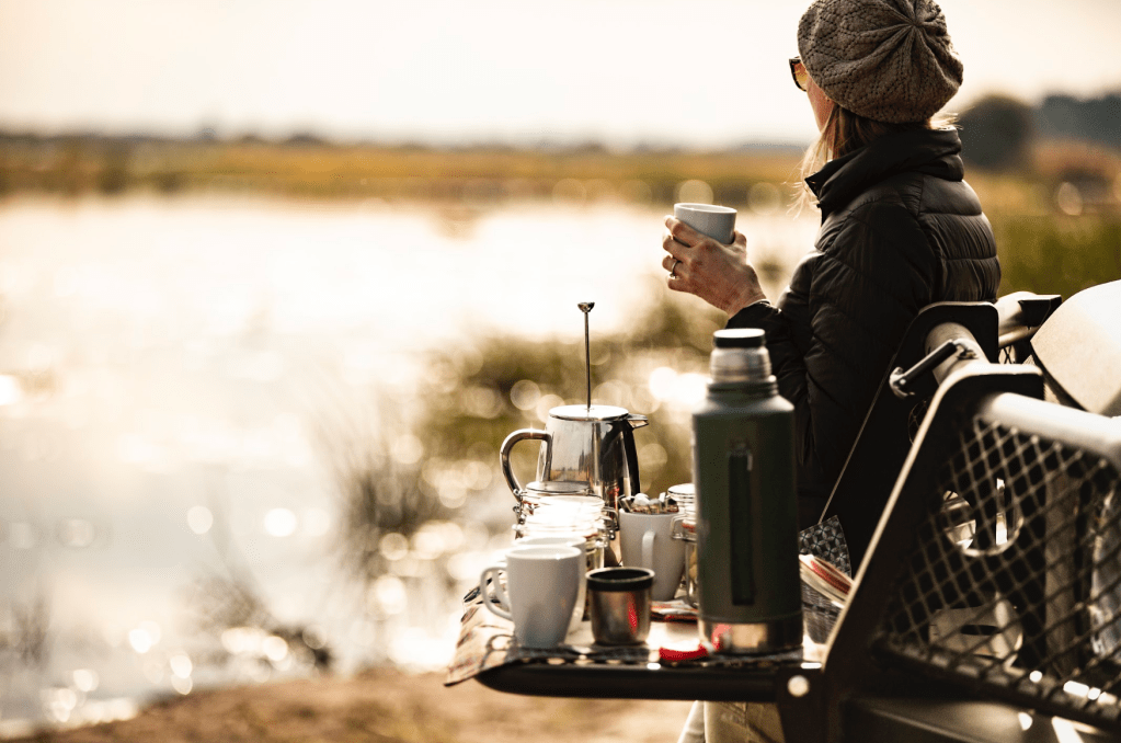 En el corazón del Delta del Okavango, cuando el cielo se tiñe de tonos lavanda y naranjas, hay un instante sagrado: el primer café del día. Estás rodeado de una sinfonía natural —el trompeteo lejano de un elefante, el chapoteo de los hipopótamos, el canto vibrante de aves exóticas— y ese aroma humeante se convierte en ancla con la tierra.