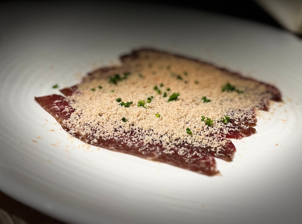 Luego, las láminas de Wagyu, tan finas que parecían suspiros, descansaban sobre el plato como un poema apenas escrito. Las virutas de foie gras caían sobre ellas como copos de oro, creando una danza de untuosidad y profundidad que se deshacía en la lengua como un secreto compartido a media voz.