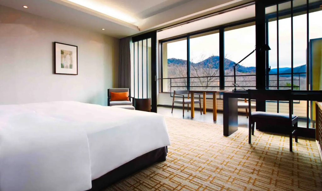 Las habitaciones son gestos de calma. Tatamis que murmuran historia, futones suaves como nubes al ras del suelo, ventanales que enmarcan postales vivas de un Japón silente, majestuoso, inmóvil. A lo lejos, el Monte Fuji observa con su corona blanca, y en cada rincón del resort se percibe la presencia del agua, en forma de onsen, de vapor, de caricia termal. Sumergirse en sus aguas calientes, con la piel arropada por minerales milenarios, es una experiencia casi mística: como si el cuerpo regresara a su estado más puro, flotando en el calor de la Tierra misma.