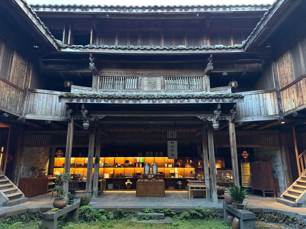 La arquitectura de los tulou, con sus muros circulares o cuadrados y su abrazo silencioso, tiene una manera de hacer que uno se sienta contenido y, al mismo tiempo, libre. Caminando por los corredores de madera del hotel, el eco de mis pasos se mezcla con el canto lejano de los pájaros, y por un instante olvido dónde termina el mundo exterior y dónde empieza este refugio. Cada habitación tiene la textura de lo vivido, un olor a madera y té que permanece en la memoria mucho después de cerrar la puerta.