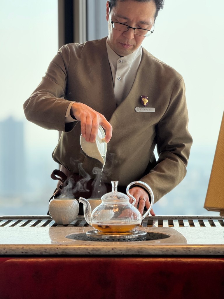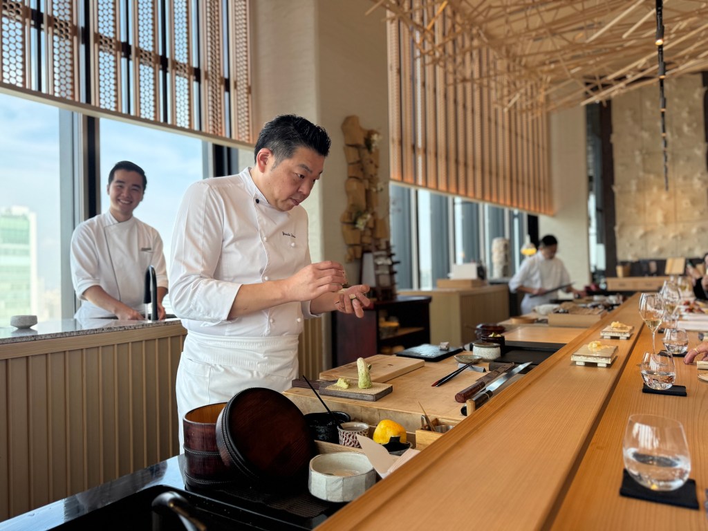 La sala de este espectacular restaurante de sushi en el Hotel Four Seasons Osaka, suspendida sobre la ciudad, tiene una belleza serena. Las texturas suaves, los tonos profundos y ciertos guiños marinos envuelven el ambiente sin distraer; aquí, el protagonismo es absoluto para el gesto del chef, para el filo del cuchillo, para el ritmo preciso con el que cada pieza toma forma frente a nosotros. Desde mi asiento, la vista del skyline parecía un telón lejano, casi irreal, mientras la experiencia se concentraba por completo en la barra.