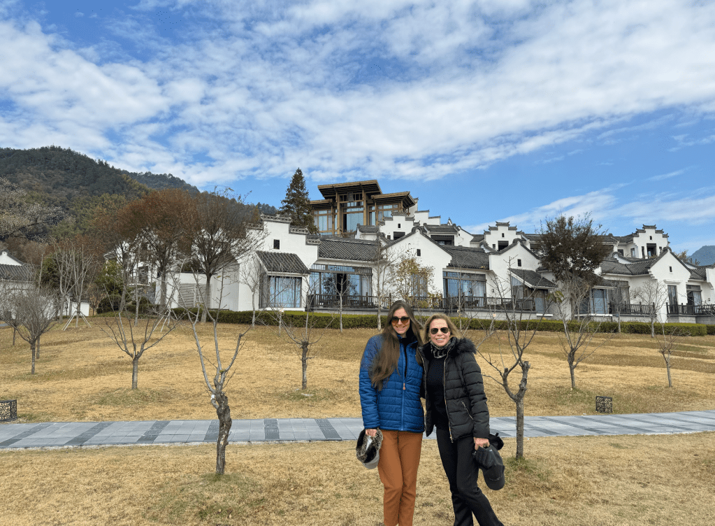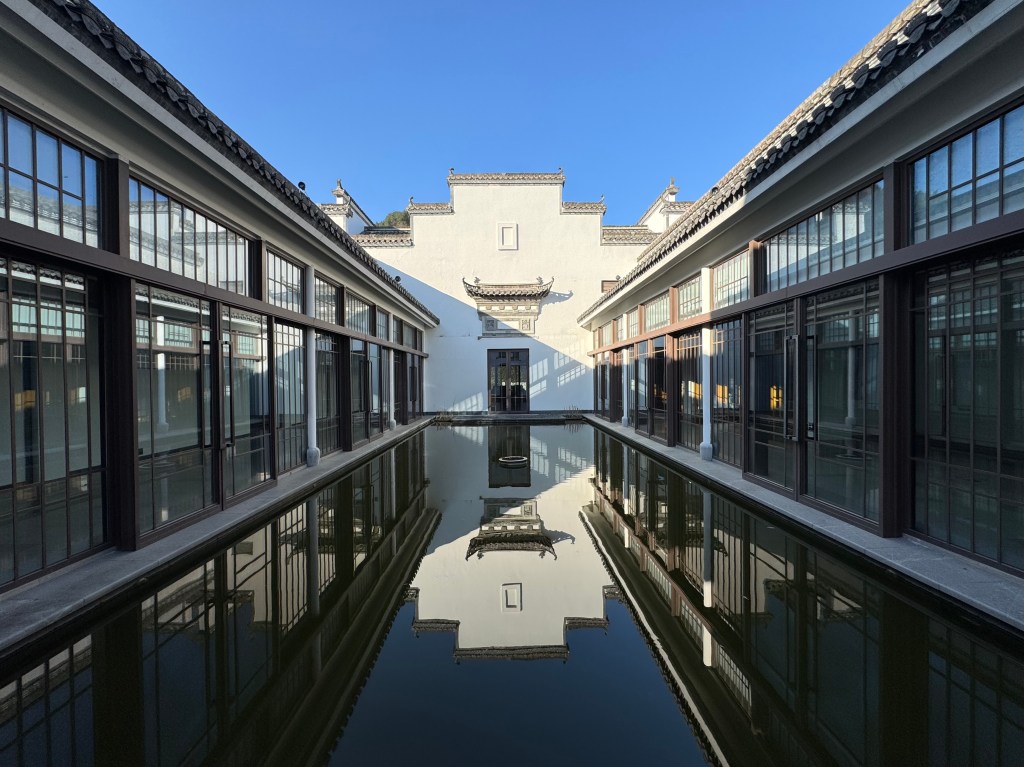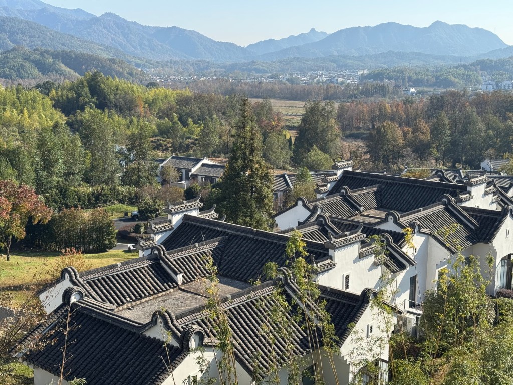 El trayecto hasta el resort es un preludio en sí mismo: carreteras que serpentean entre aldeas antiguas, campos verdes y colinas que se pierden en la bruma. Cuando el hotel finalmente aparece, lo hace con una naturalidad casi invisible: su arquitectura combina piedra clara y madera cálida, integrándose al paisaje como si siempre hubiera estado allí. Cada ángulo parece pensado para rendir homenaje a las montañas Huangshan, esas que han inspirado poetas y pintores durante siglos.