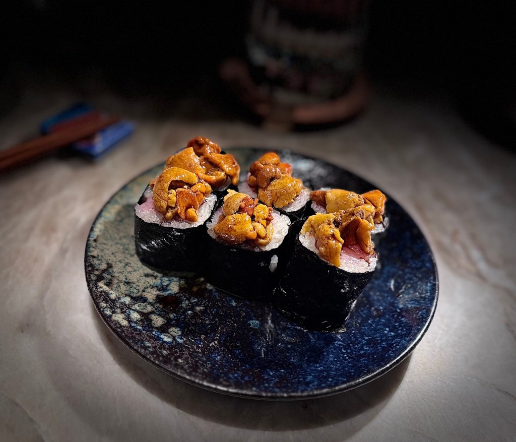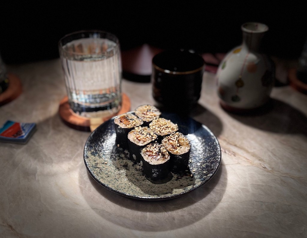 Los platillos llegan sin prisa, uno a uno, permitiendo que cada bocado tenga su propio tiempo. El maki de anguila destaca por su equilibrio: la textura sedosa del pescado, el dulzor profundo de su glaseado y un arroz que acompaña sin imponerse. Es un bocado cálido, casi reconfortante, que se queda en la memoria. El rollo de atún toro con erizo de mar, por su parte, es una expresión de indulgencia medida. Grasa limpia, untuosidad marina, un encuentro preciso entre dos ingredientes que no requieren adornos. Todo sucede en silencio, como si el océano decidiera hablar en voz baja.