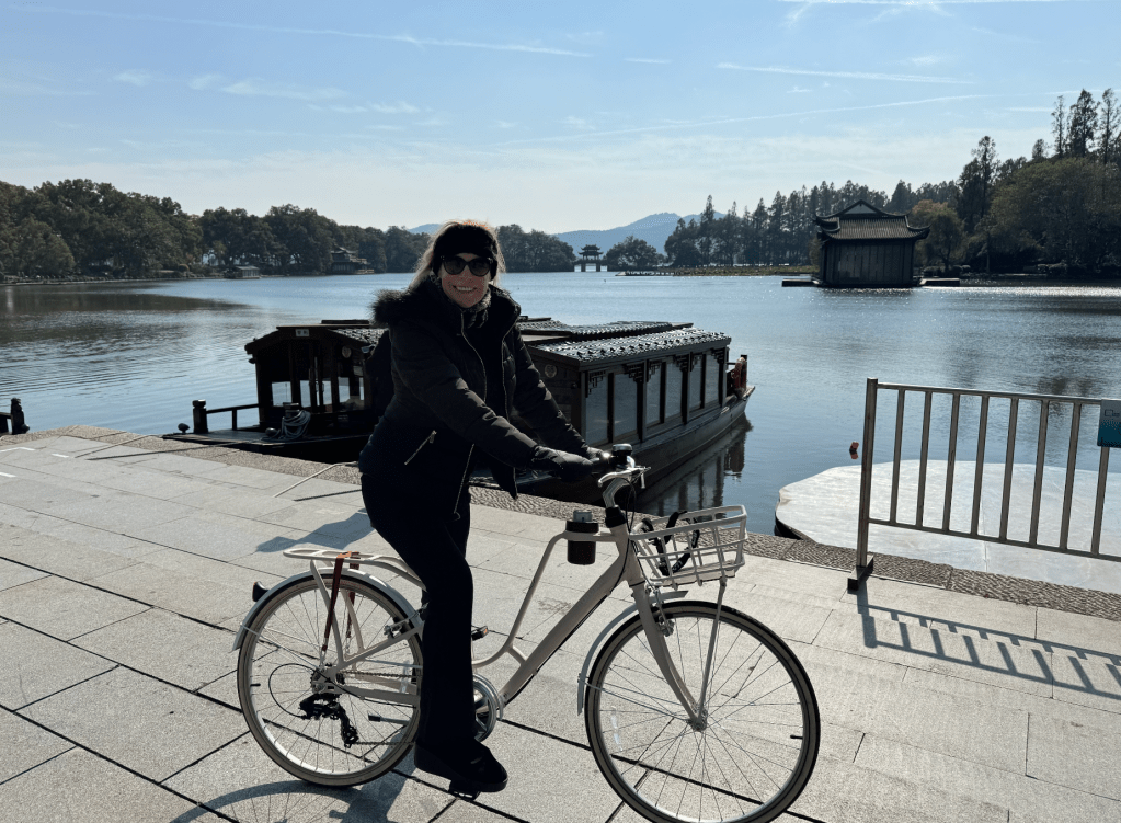 Una de las experiencias que más profundamente me marcó fue recorrer el West Lake en las bicicletas del hotel, avanzando despacio, sin rumbo fijo, como si el tiempo se hubiera vuelto circular. Pedaleábamos bordeando el agua, entre sauces que rozaban la superficie del lago y senderos que parecían dibujados para la contemplación. El aire era fresco, perfumado de vegetación húmeda y flores invisibles, y cada curva revelaba una escena distinta: pagodas emergiendo entre la bruma, reflejos temblorosos sobre el agua, caminantes silenciosos que parecían formar parte del paisaje. En ese recorrido pausado comprendí que Hangzhou se revela mejor así, a la altura del cuerpo y del ritmo del corazón.