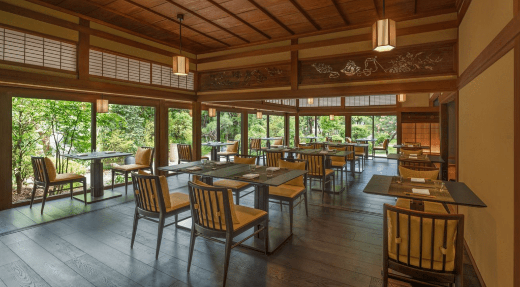 El espacio acompaña esta filosofía. El diseño interior combina líneas minimalistas con materiales nobles que evocan la arquitectura clásica japonesa: madera, piedra y luz natural filtrada con suavidad. Desde el comedor, las vistas a jardines cuidadosamente compuestos invitan a la contemplación, reforzando la sensación de que el acto de comer es también un momento de pausa.